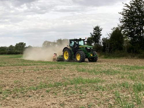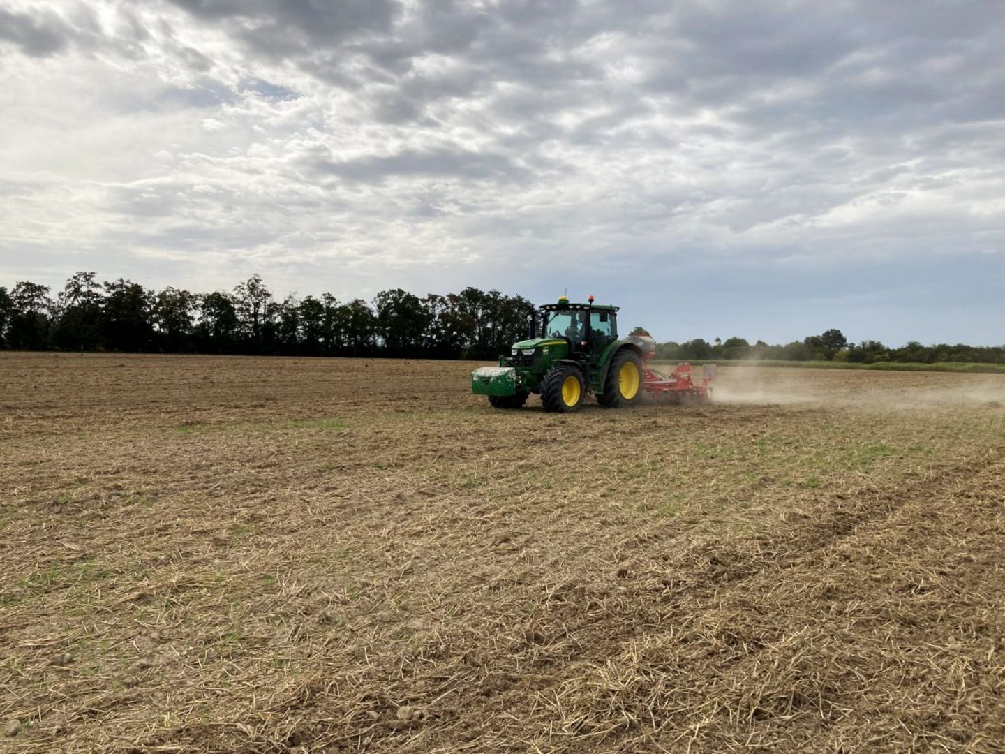 Auf dem künftigen Hauptversuchsfeld werden die Wintergetreide-Flächen für die Aussaat vorbereitet und flach mit der Scheibenegge bearbeitet. Ausfallgetreide wird dadurch entfernt und die grüne Brücke, in der sich Blattläuse und andere Virusvektoren vermehren, wird gebrochen.