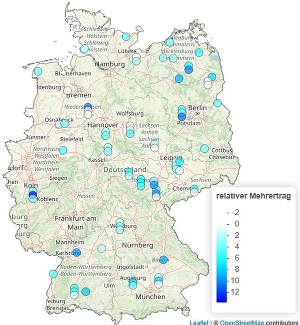 Dass diese Systeme in ganz Deutschland erfolgreich sind, zeigt die Karte in Abbildung 1. Hier sind Ergebnisse der Exaktversuche aus den letzten drei Jahren in ganz Deutschland dargestellt. Jede Markierung stellt einen Versuch dar. Mehrere Versuche am gleichen Standort in unterschiedlichen Jahren sind untereinander angeordnet. Je intensiver die Färbung, desto höher war der Mehrertrag der vorzüglichen nitrifikationsinhibierten und somit ammoniumstabilisierten Systeme im Vergleich zur konventionellen nitratbetonten Düngung mit Kalkammonsalpeter.